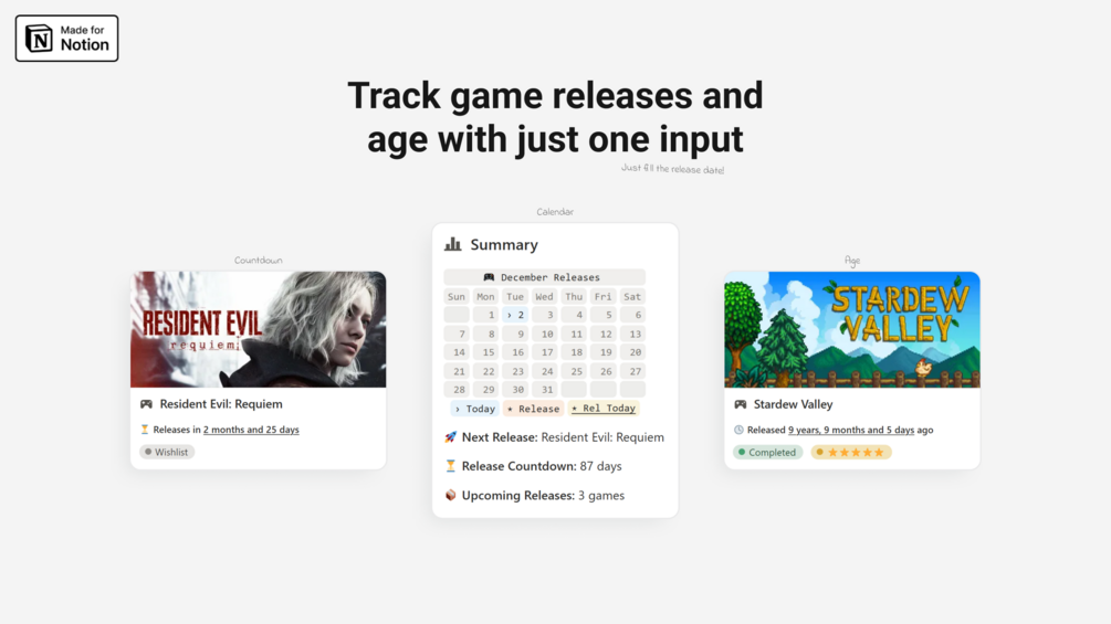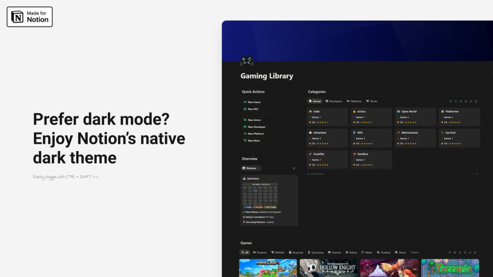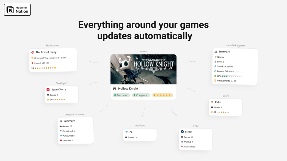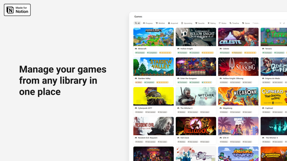 The Gaming Library is a Notion template designed to bring together all your games from any platform or store in a fun way. Rich in features without taking your focus away from gaming, and built with attention to detail in a clean interface.