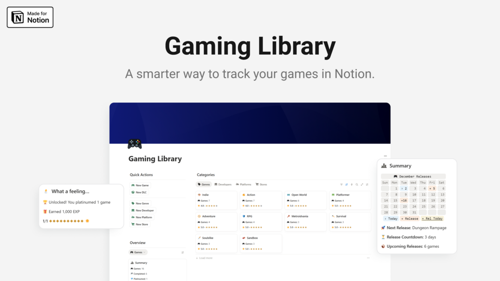The Gaming Library is a Notion template designed to bring together all your games from any platform or store in a fun way. Rich in features without taking your focus away from gaming. It is built with attention to detail in a clutter-free interface.