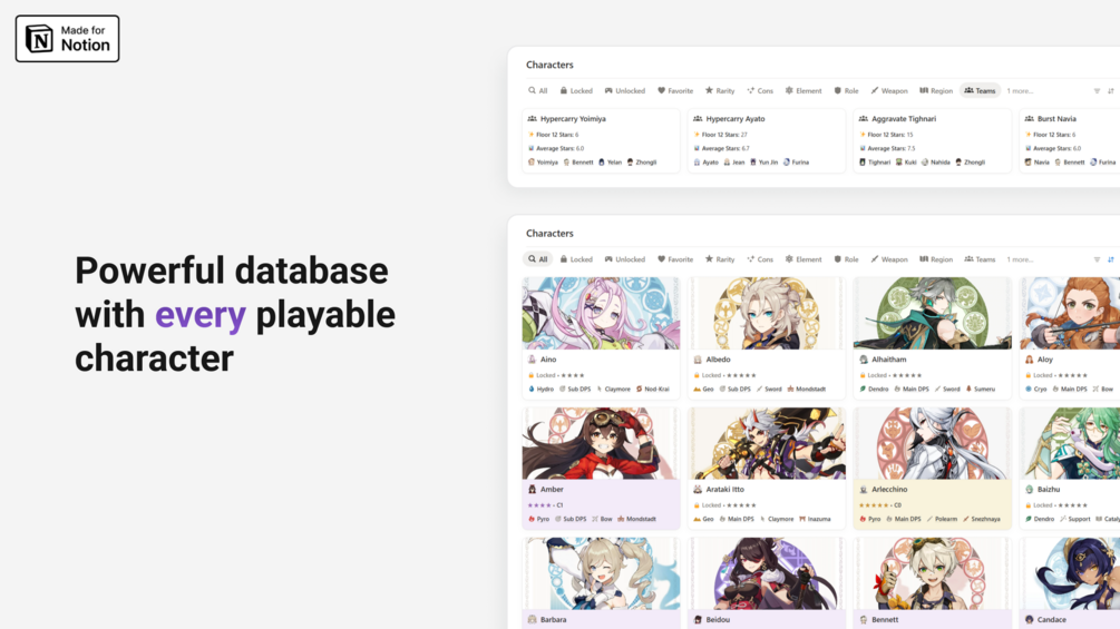 This is a fan-made tool created by an independent creator. Genshin Impact, game assets, and related content are trademarks and copyrights of HoYoverse. This template is not affiliated with or endorsed by HoYoverse or Notion. No copyright infringement is intended.