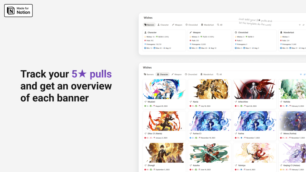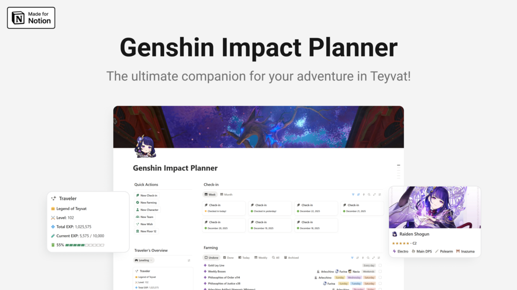 The unofficial Genshin Impact Planner is a Notion template designed to help you streamline your farming with smart resin planning, track your 5โ pulls, and keep your characters progressing smoothly.