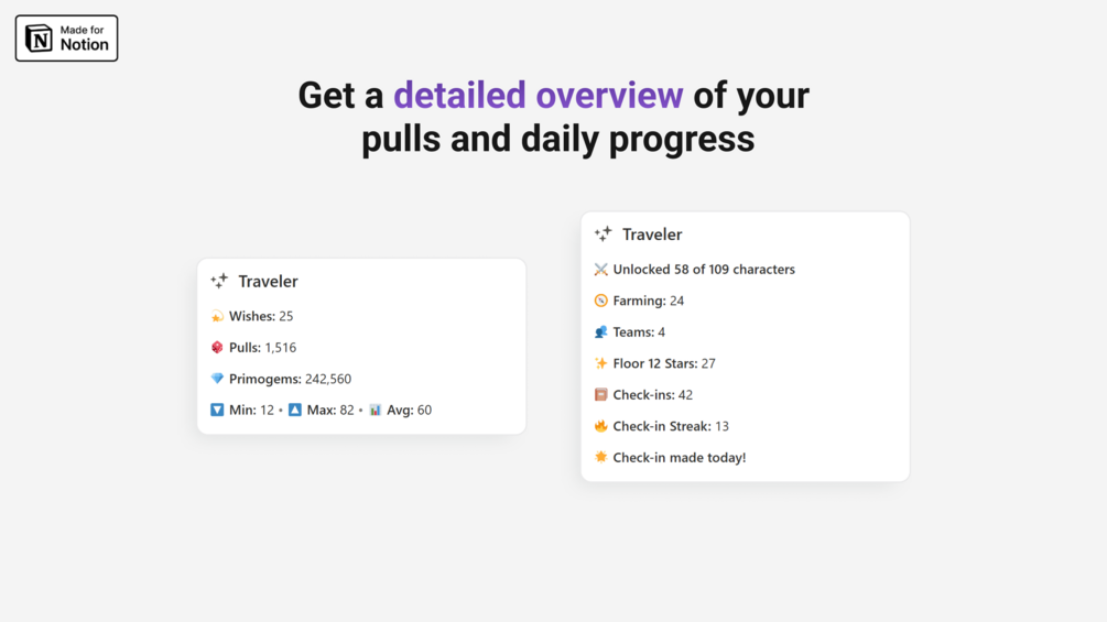 This Notion template lets you plan your weekly farming, track 5โ pulls, include a database of every playable character, and more. All in one organized place, making it the ultimate companion for your journey in Teyvat!