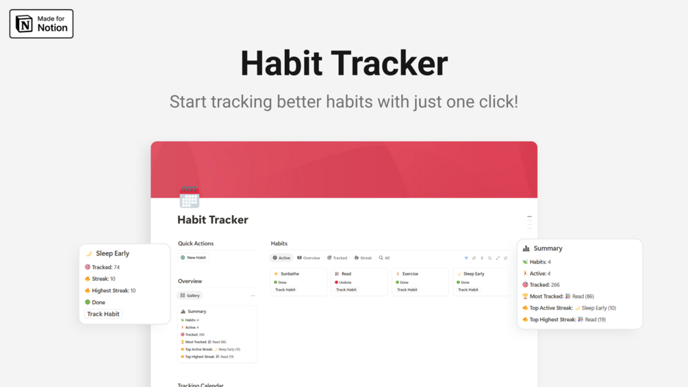 The Habit Tracker is a Notion template that makes your habit tracking simple and effortless, with smart automations and a clean interface.