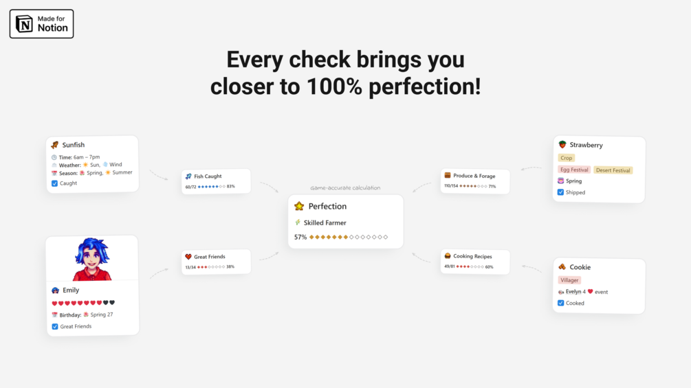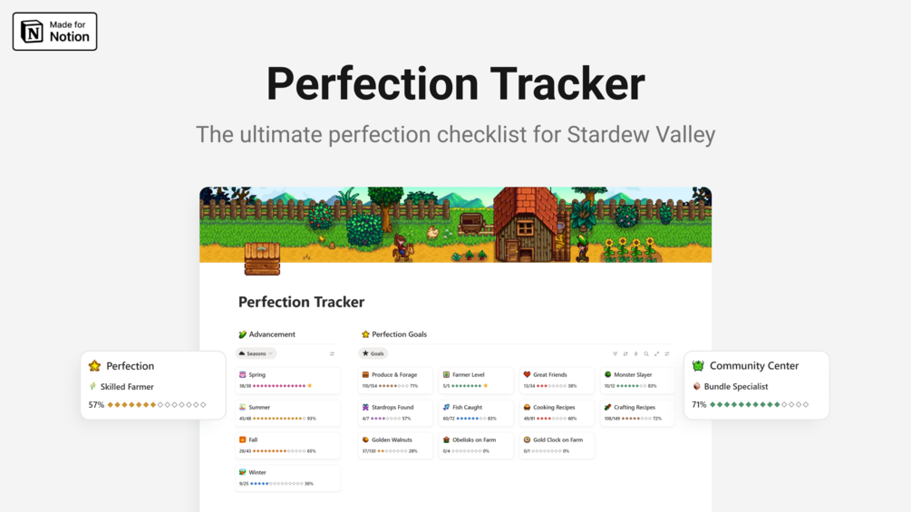 The Perfection Tracker is an unofficial Notion template designed to help you on your journey to 100% perfection in Stardew Valley, making the process fun with a thoughtfully crafted tracking system that requires nothing more than checking boxes.