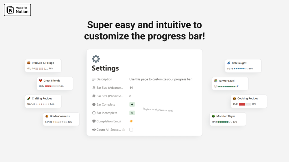 Tweak emojis, progress bars, or counting methods. No formulas or setup required!